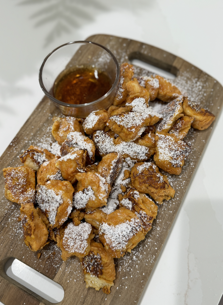- Sprinkle powdered sugar over the french toast and drizzle on maple syrup, if desired, before serving.